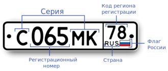 - Регистрационный знак. Свидетельство регистрации транспортного средства маркируется специальным набором символов. Он формируется из 2-х компонентов. Слева прописывается три буквы и столько же цифр, а справа — код области РФ (в него входит два или три знака). Дальше прорисовывается флаг России и английская аббревиатура названия государства (RUS). На образце свидетельства о регистрации транспортного средства можно увидеть не больше 12 символов, состоящих из букв русского алфавита. Они подобраны таким образом, чтобы была возможность дублирования с латинскими буквами. В СТС применяется А, В, Е, K, М, Н, O, Р, С, T, У, Х.