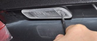 Поворачиваем патрон против часовой стрелки и вынимаем его вместе с лампочкой W5W. Выдергиваем сгоревший прибор, вставляем новый и устанавливаем плафон на место, проследив за тем, чтобы фиксаторы защелкнулись.